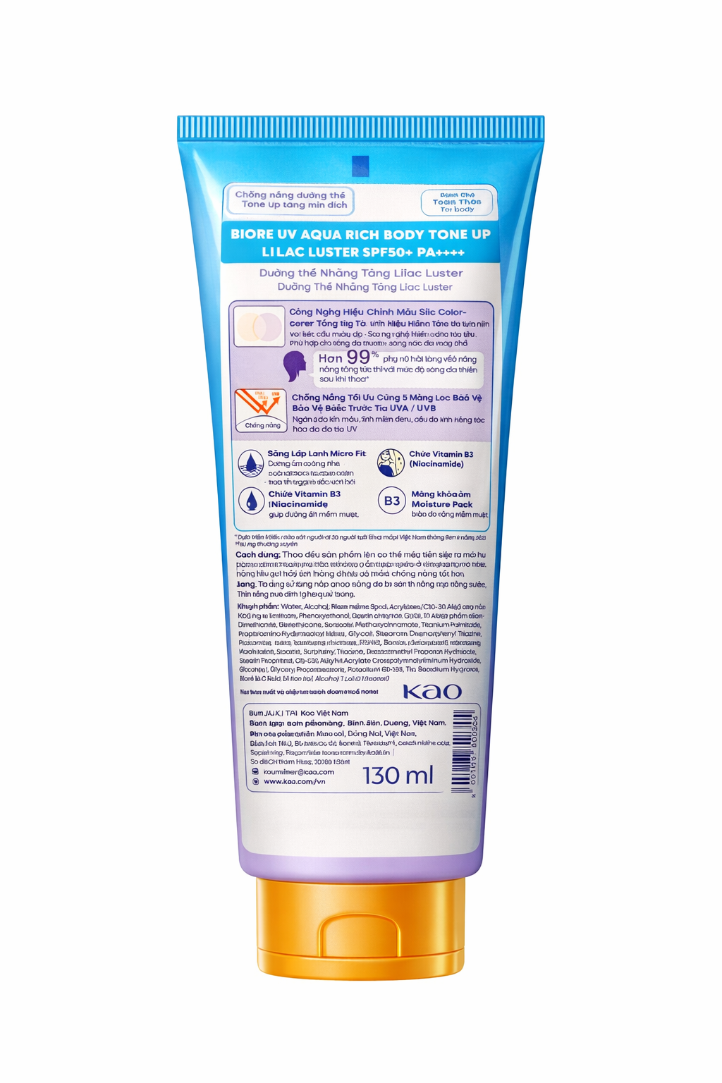 Serum Chống Nắng Dưỡng Thể Tone-Up Toàn Thân Bioré UV Aqua Rich Tone Up Serum SPF 50+ PA+++ 130ml giúp bảo vệ da toàn diện trước tia UV, đồng thời nâng tone da nhẹ nhàng với sắc tím Lilac thời thượng. Kết cấu dạng serum mỏng nhẹ, thẩm thấu nhanh, mang lại làn da sáng mịn, rạng rỡ tự nhiên suốt cả ngày.